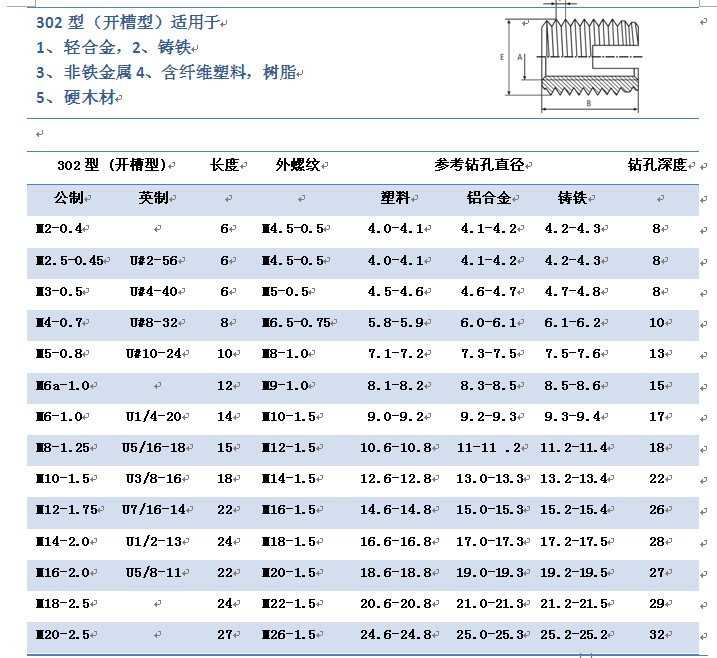 (1)開槽型,又名302型,螺套頭部開有一個切削槽,實現自攻特性;